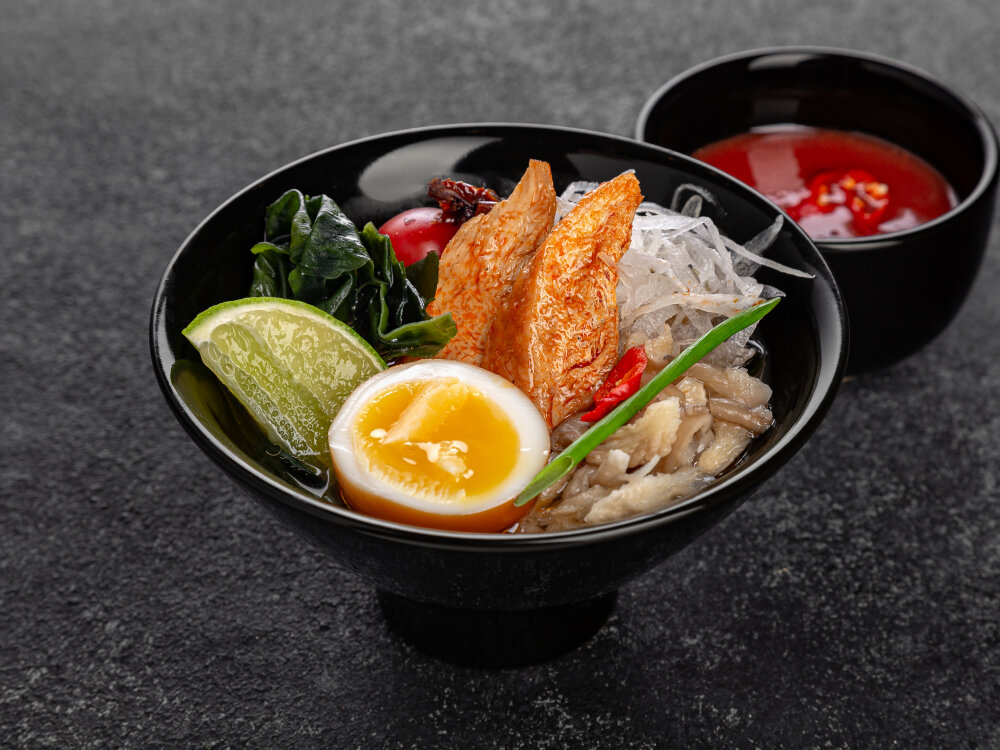 Погрузитесь в атмосферу азиатской кухни с супом Рамен с курицей — горячим и ароматным блюдом, в котором нежный куриный бульон гармонично сочетается с сочной курицей и перепелиным яйцом