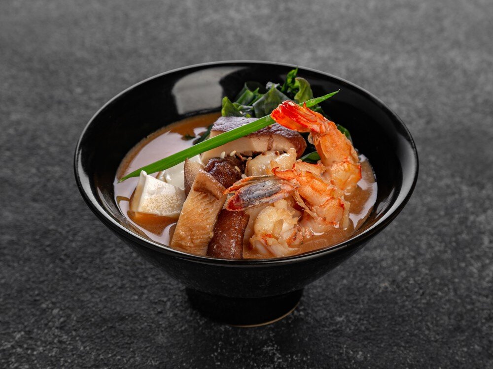 Погрузитесь в мир восточных вкусов с нашим супом, где нежные тигровые креветки и грибы шиитаке гармонично сочетаются с богатым вкусом мисо-пасты, а свежесть водорослей и черри придают блюду утончённость.